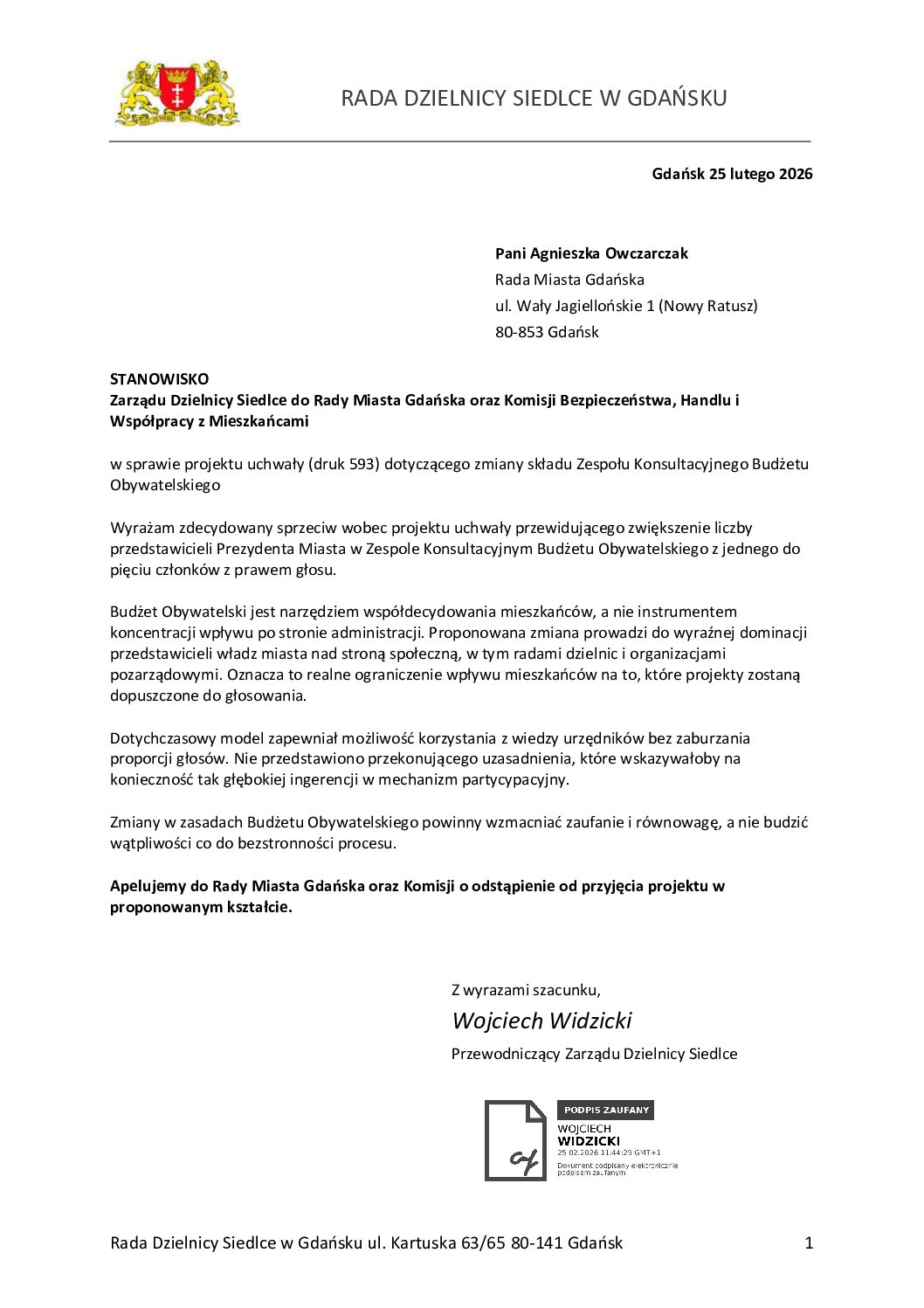 Przekazałem do Rady Miasta Gdańska oraz Komisji Bezpieczeństwa, Handlu i Współpracy z Mieszkańcami stanowisko Zarządu Dzielnicy Siedlce w sprawie planowanych zmian w składzie Zespołu Konsultacyjnego Budżetu Obywatelskiego.